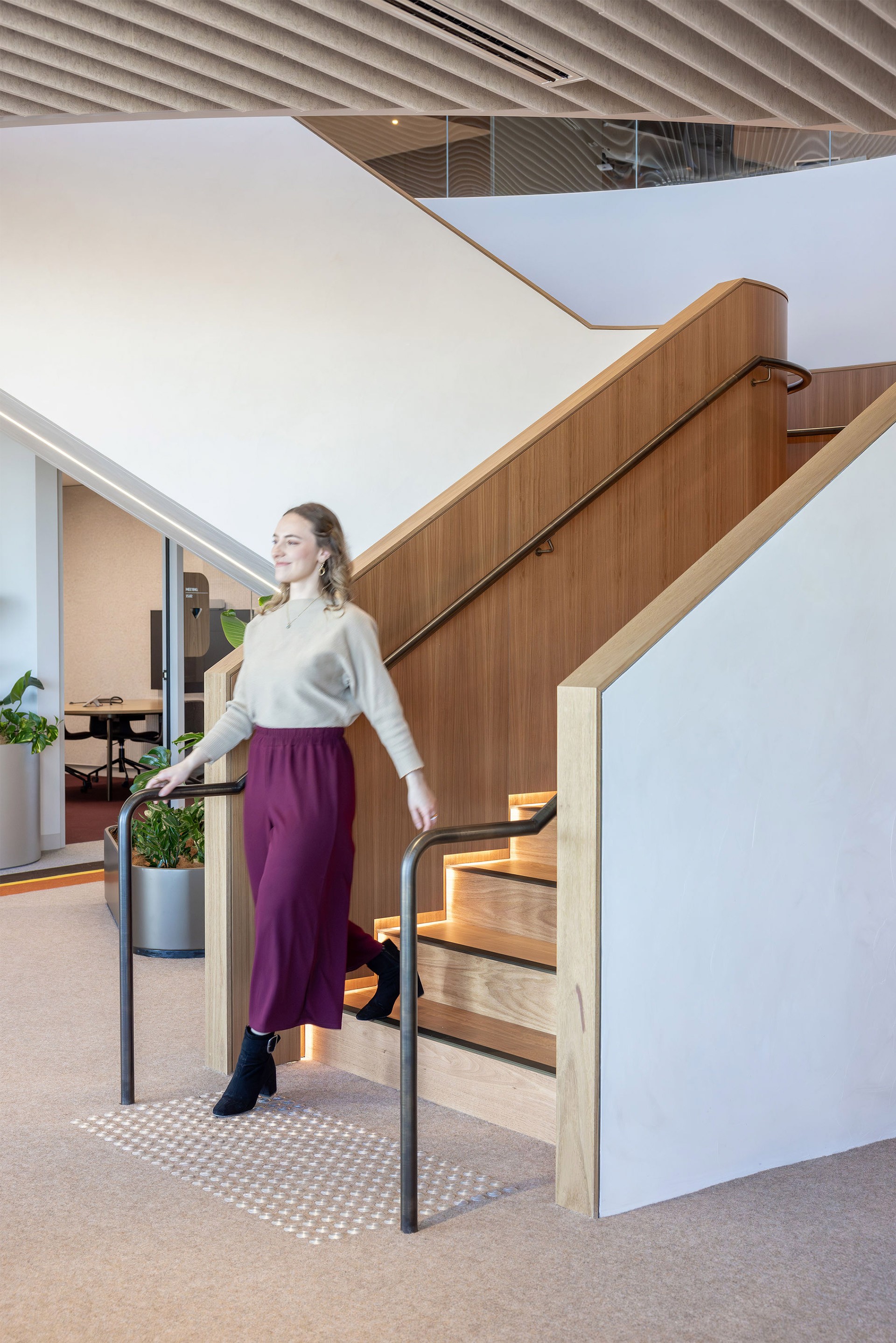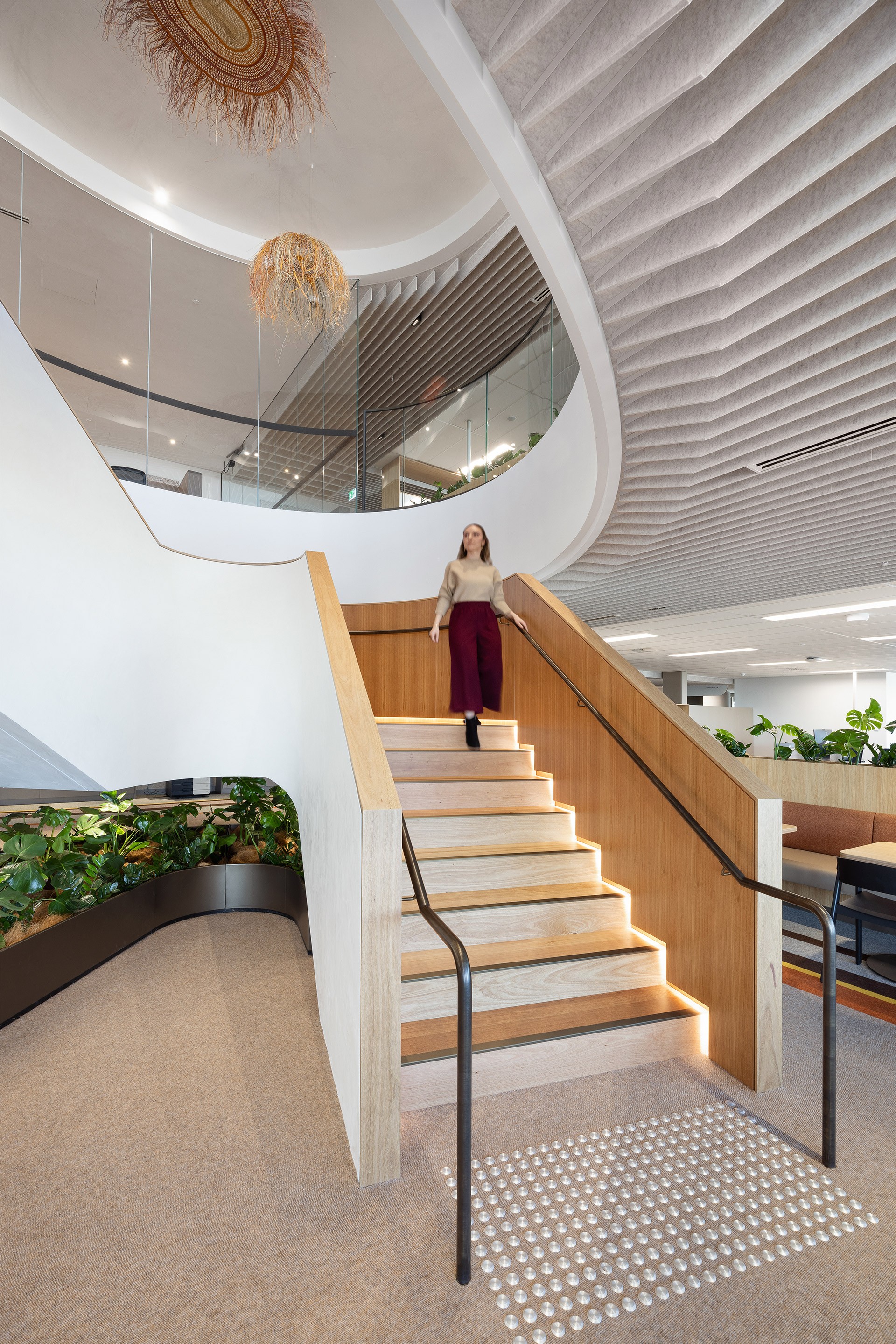 Asentis played a pivotal role in delivering this staircase, which features timber treads, black handrails, and integrated LED lighting. Early collaboration with Allianz enabled a strong understanding of their vision, allowing Asentis to contribute meaningfully to design feasibility and refinement. Working closely with key stakeholders, the team ensured every element was carefully considered and seamlessly executed.