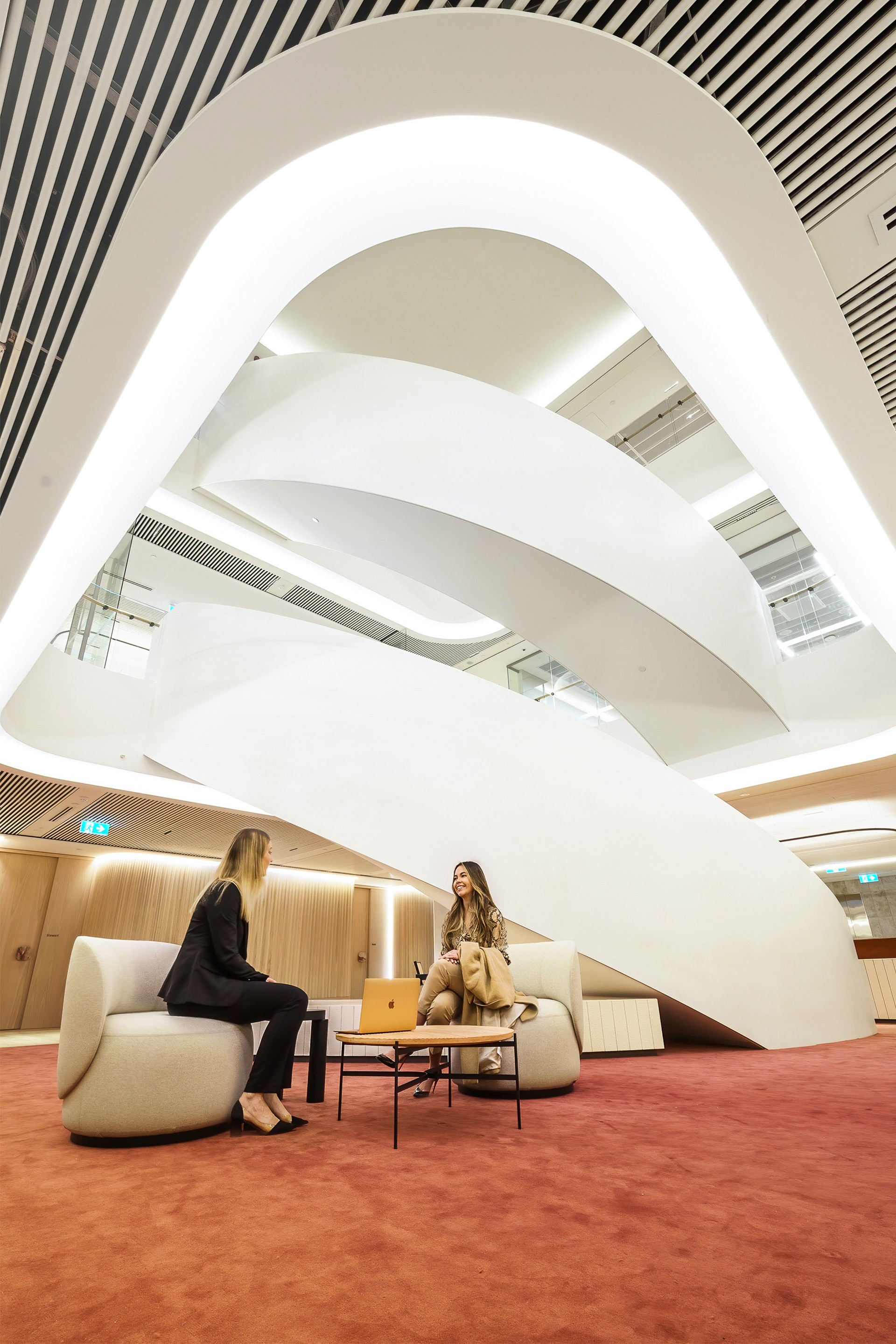 Spread across three levels, the workplace – designed by award-winning architects Bates Smart – brings Ashurst’s values of agility, sustainability and collaboration to life. The design blends natural materials, soft curves, light and transparency to create a space that feels open, human, and inherently local. Traditional meeting rooms sit comfortably alongside shared zones and quiet work areas – reflecting a balanced, modern way of working.
