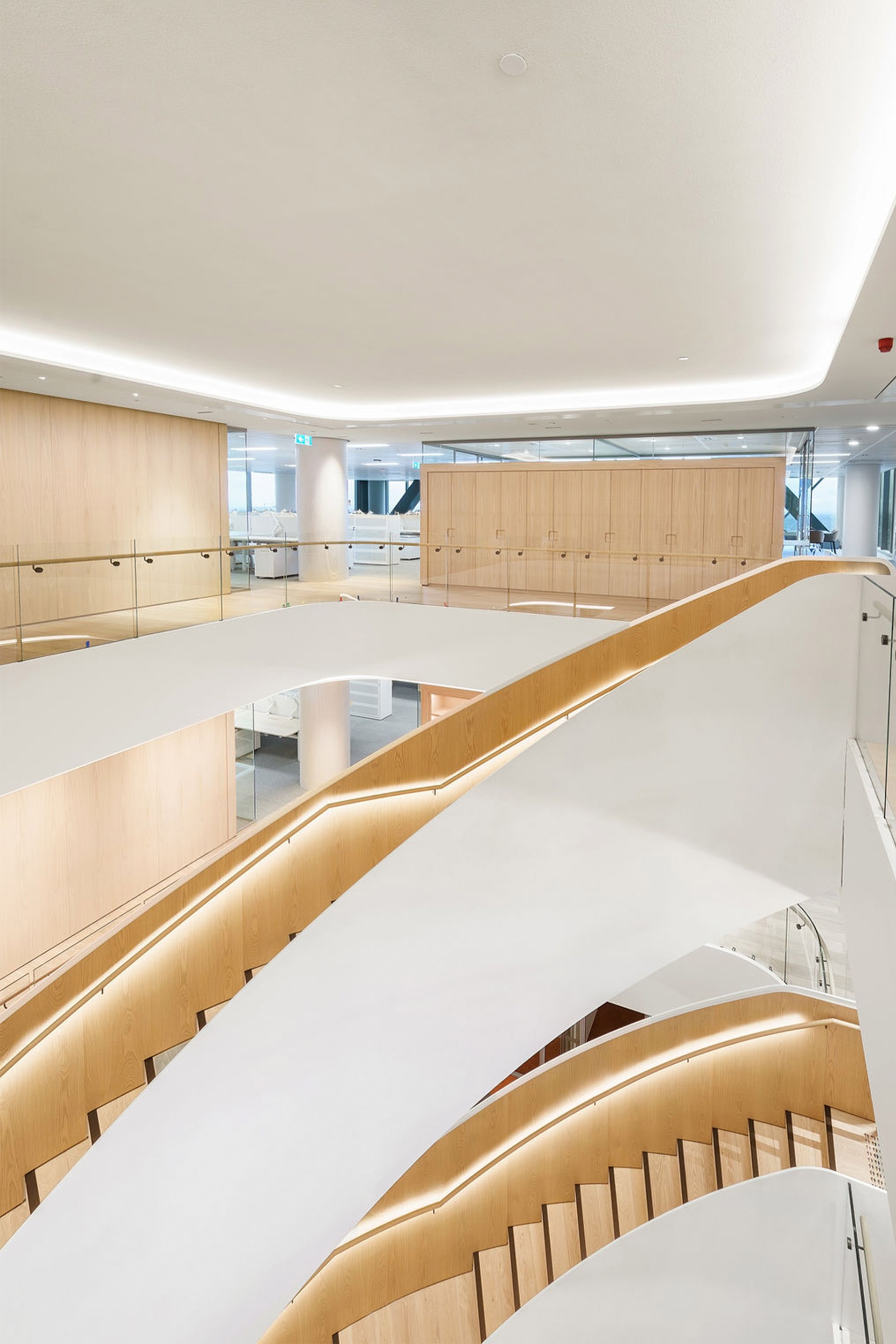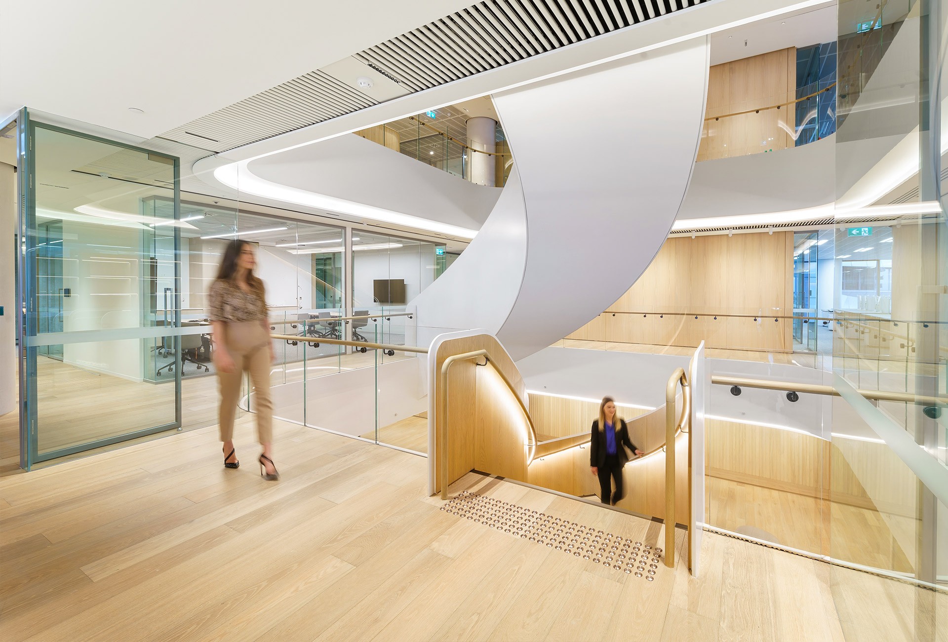 At the centre of it all, a sweeping curved staircase connects the workplace both physically and culturally. Designed and constructed by Asentis, the stair makes a bold yet refined statement – crafted from curved steel plates and finished with warm timber handrails and seamless joinery. Encircled by key amenities and breakout spaces, it invites movement, conversation and connection – anchoring the space with elegance and intent.