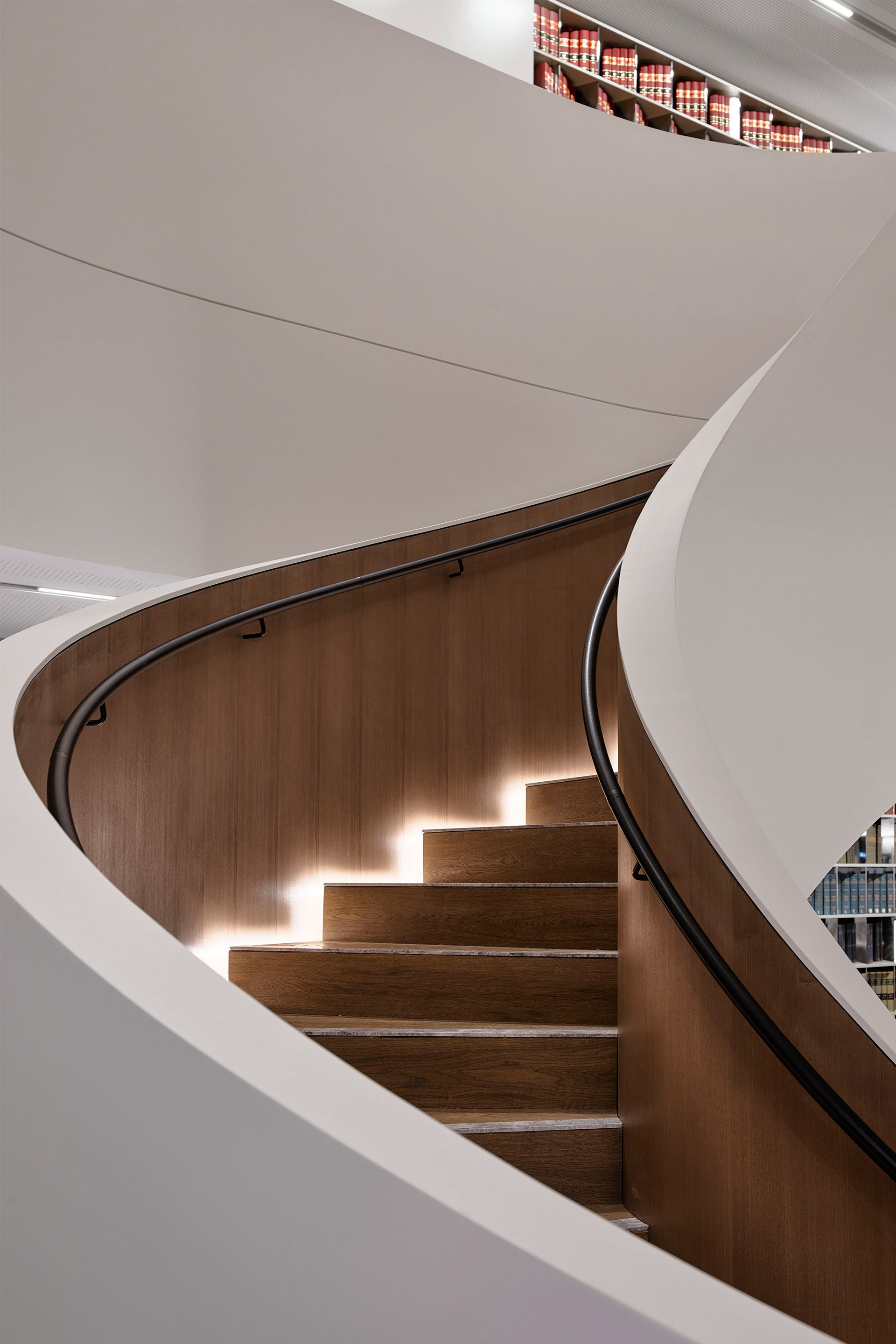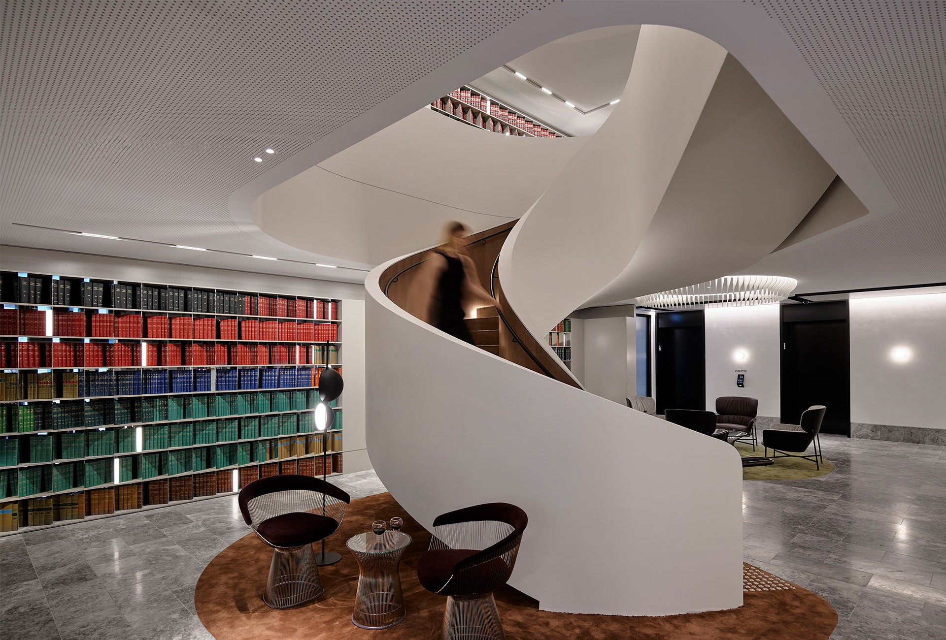 At the heart of the fit-out, surrounded by Banco’s impressive legal book collection, is the helical feature staircase—an architectural centrepiece that draws clients through the space into the very heart of Banco Chambers.