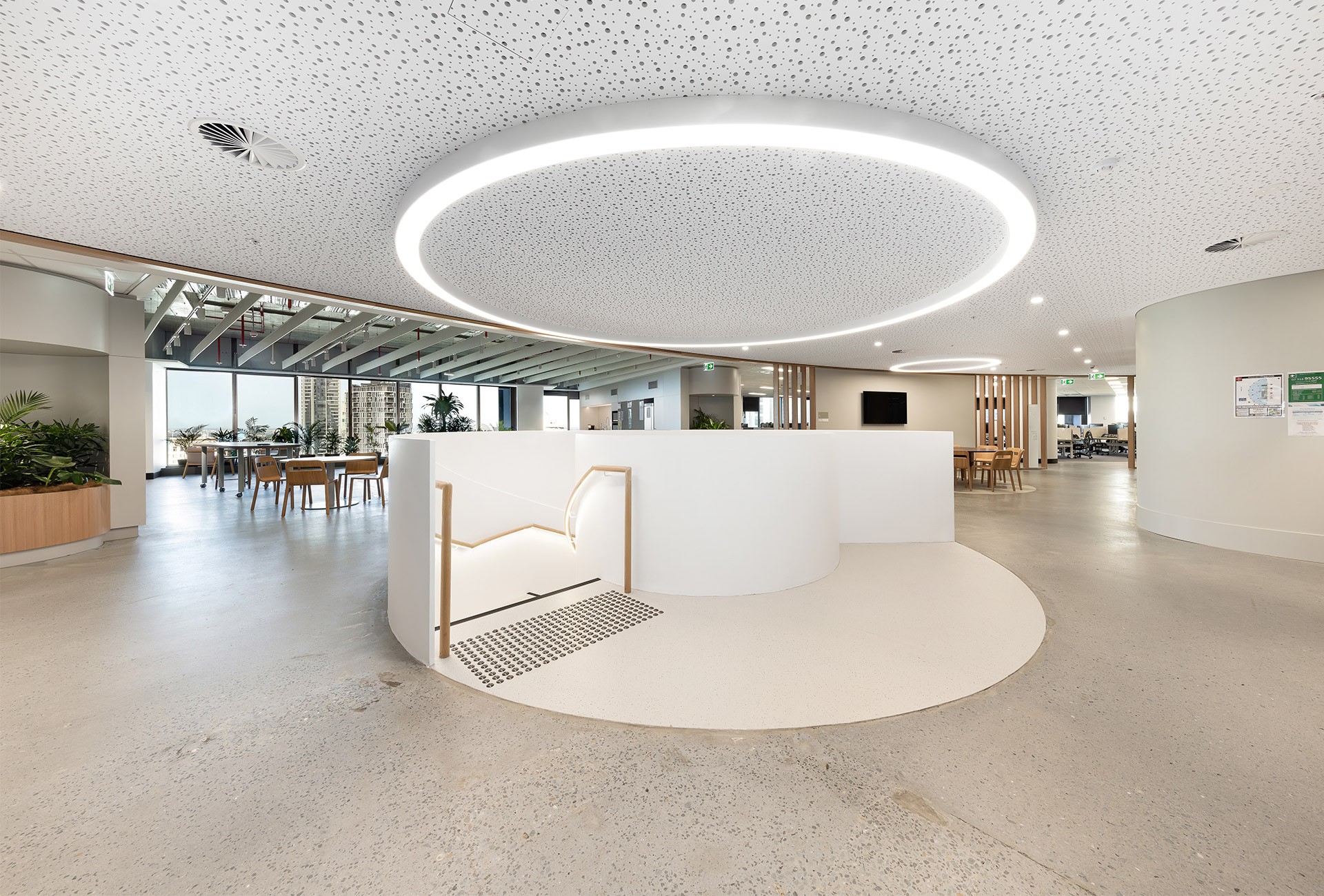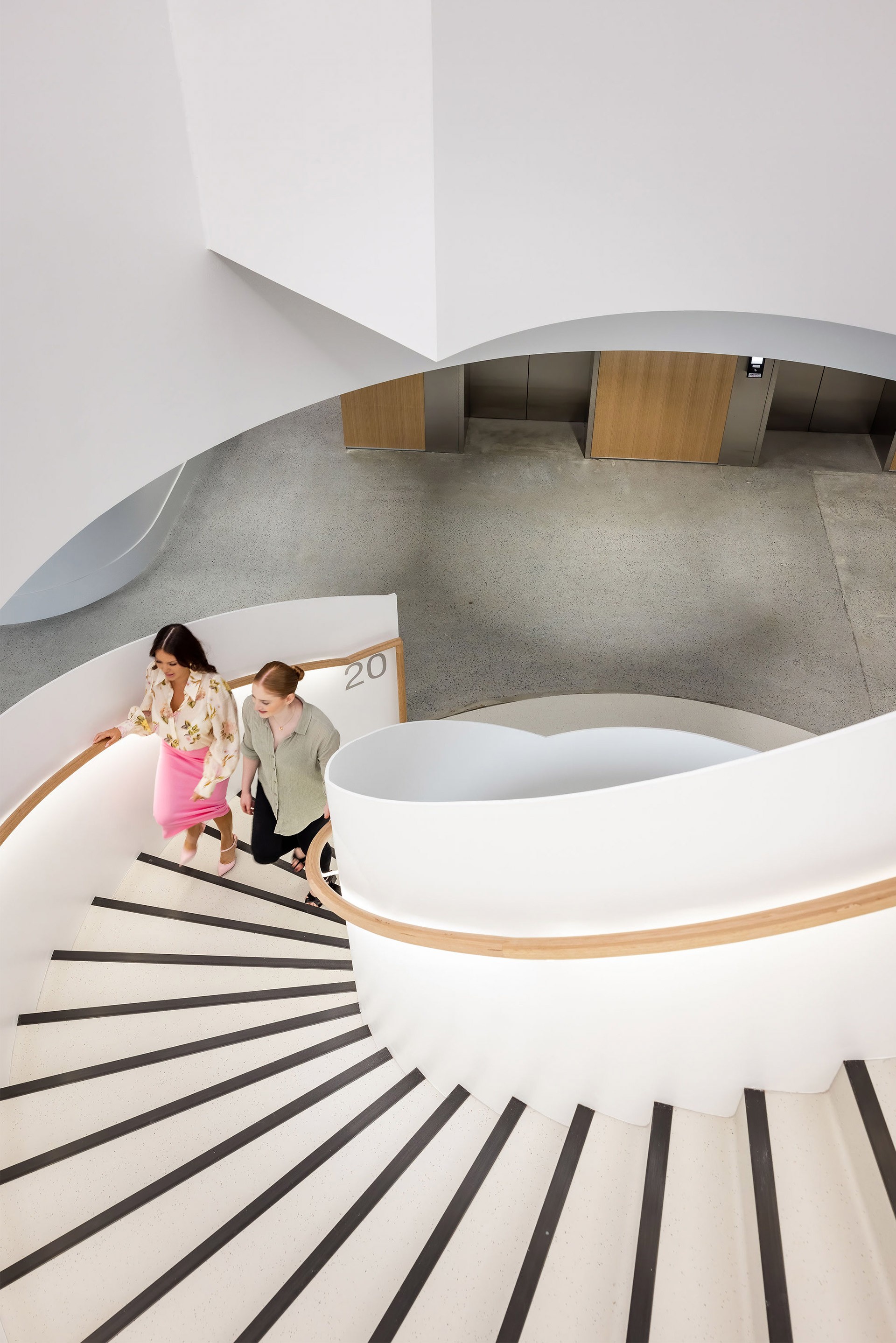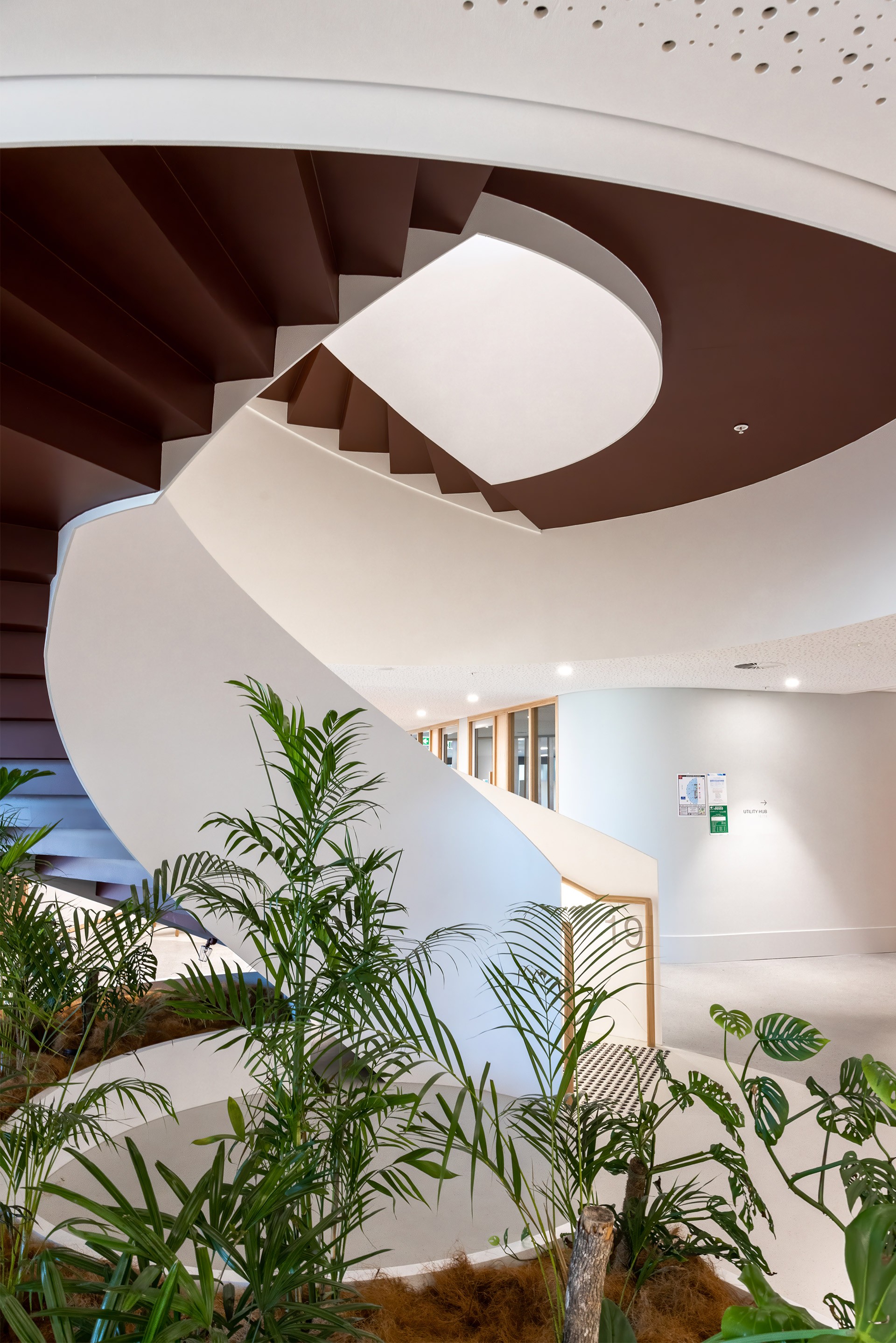 Inspired by the textures and tones of native flora, the stair features a subtle, natural colour palette that threads across 13 floors. The vertical circulation includes three double-height stairs, two single flights, and a striking 5.5-metre helical stair—each element contributing to an intuitive and uplifting flow through the building.