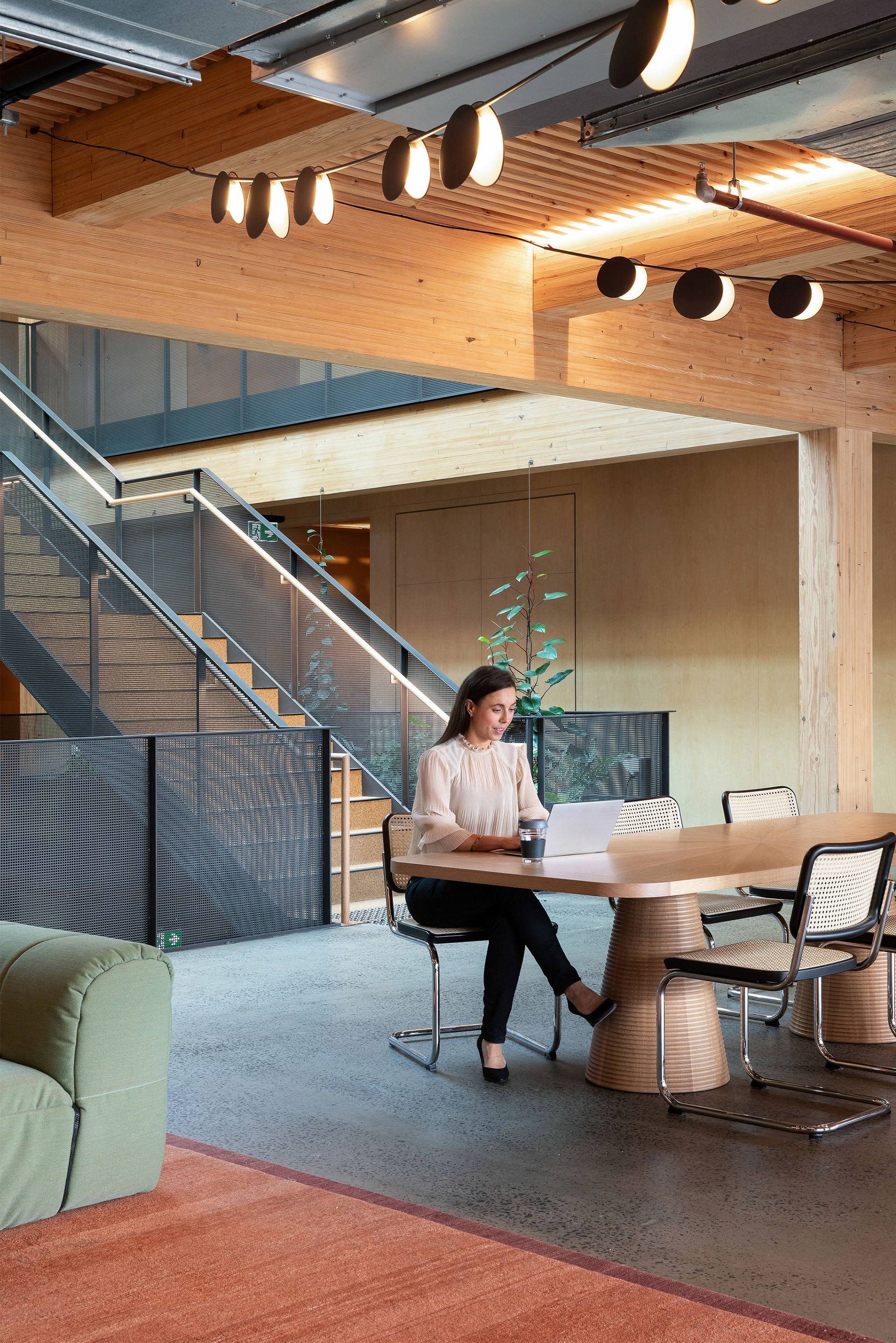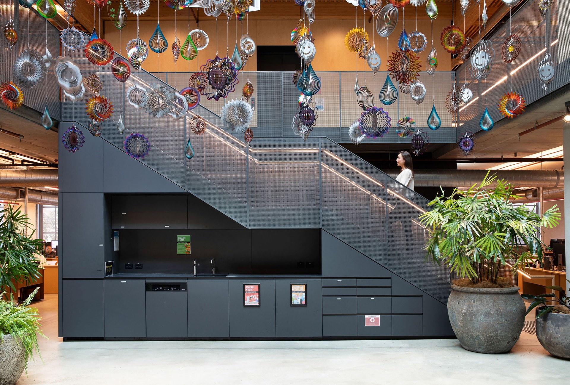 Ascending the stair, the material palette shifts to a treehouse-like atmosphere on the top floor, featuring cross-laminated timber columns and pine batten ceilings that complement the industrial heritage of the space. Adding to the sense of wonder is Spinner Forest, a kinetic art installation by renowned American artist Nick Cave, featuring 480 unique spinners that reflect the vibrant company culture. Playful design details—carefully selected colours, materials, and props—further enrich the workplace, creating a lively, neighbourhood-like environment where employees feel at home, inspired, and connected.