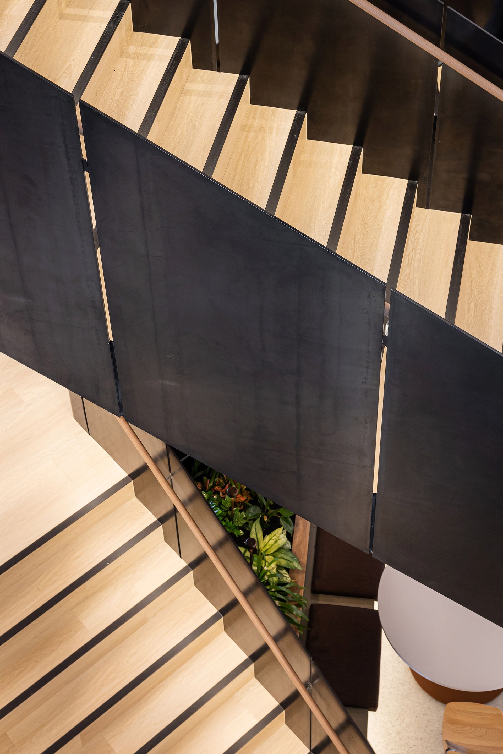 At the heart of this new workplace is a striking three-storey spiral staircase, collaboratively designed by Asentis and WMK Architecture. Crafted from custom blackened steel plates, the stair is both a functional connector and a visual focal point that embodies modernity and connectivity. Its seamless integration of Indigenous design elements, alongside warm touches like timber vinyl flooring and handrails, creates a space that’s as inviting as it is innovative. The result is a transformative architectural feature that strikes a perfect balance between industrial aesthetics and a welcoming atmosphere, encouraging collaboration and interaction among employees.