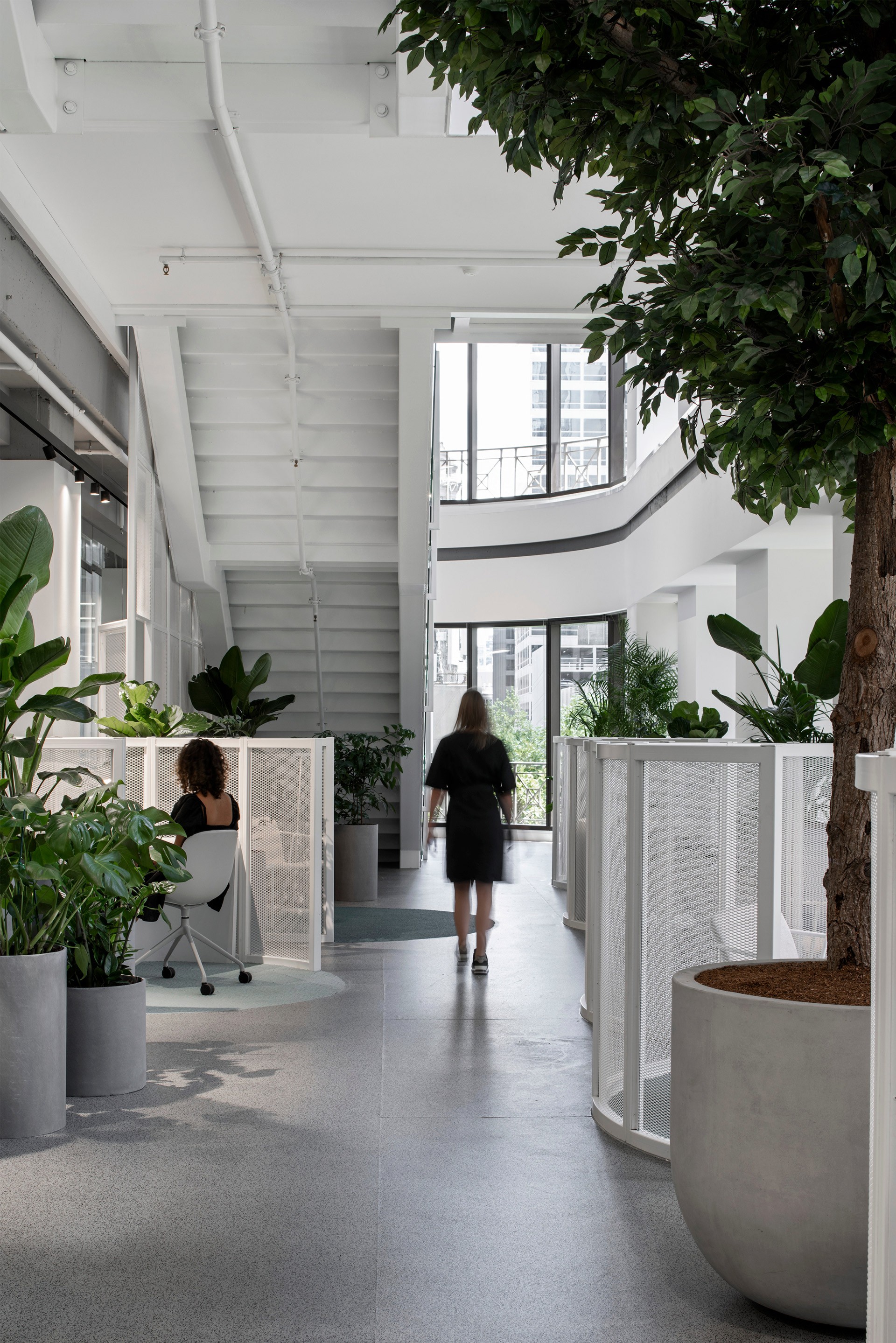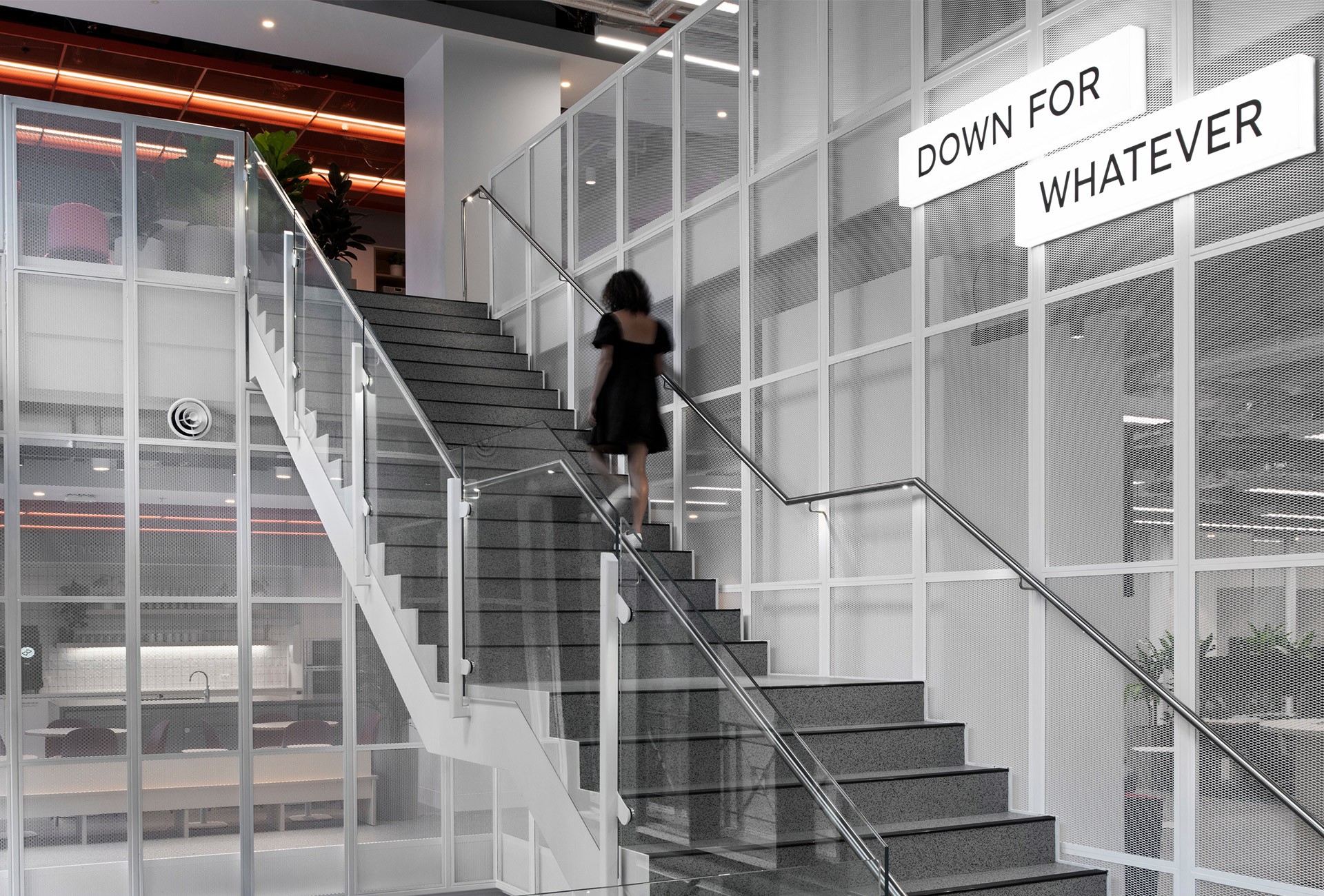 The corner atrium permeates the space with light, framed with perforated metal, and inter-connected by a continual cascading stair design spanning all 3 levels. The internal staircase is a straight flight stair connecting level 5 to level 7 with a mid-landing at level 6. The structure of the stairs is fabricated with 12mm mild steel plate and finished with glazed balustrades and stainless steel handrails. The forum staircase at level 8 further fosters an immersive and connected community, creating a theatre-like auditorium zone that is totally on the money for the campus-style interior design. Above the forum staircase is lit by futuristic and industrial style lighting, which is tailored to the company’s unique branding.