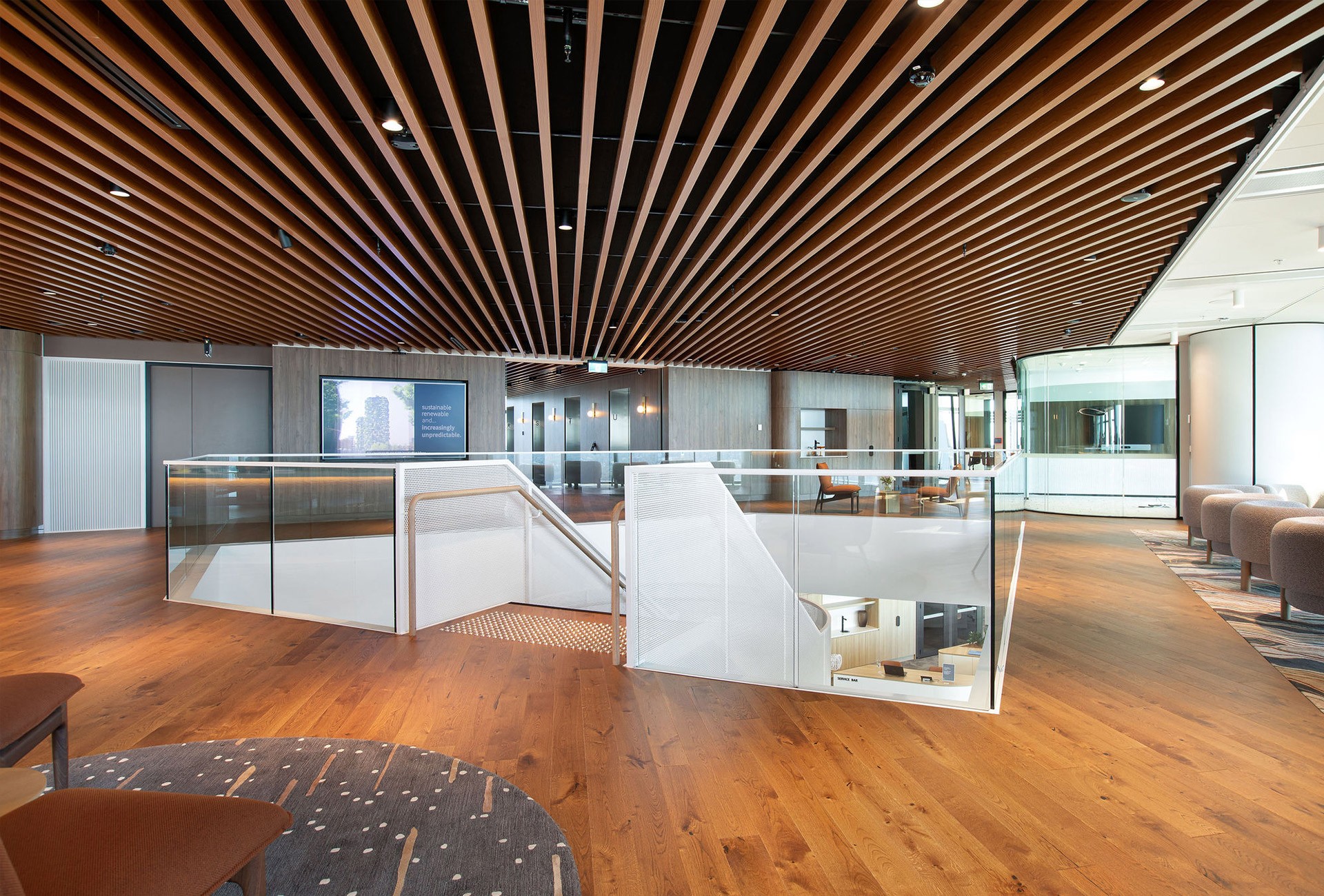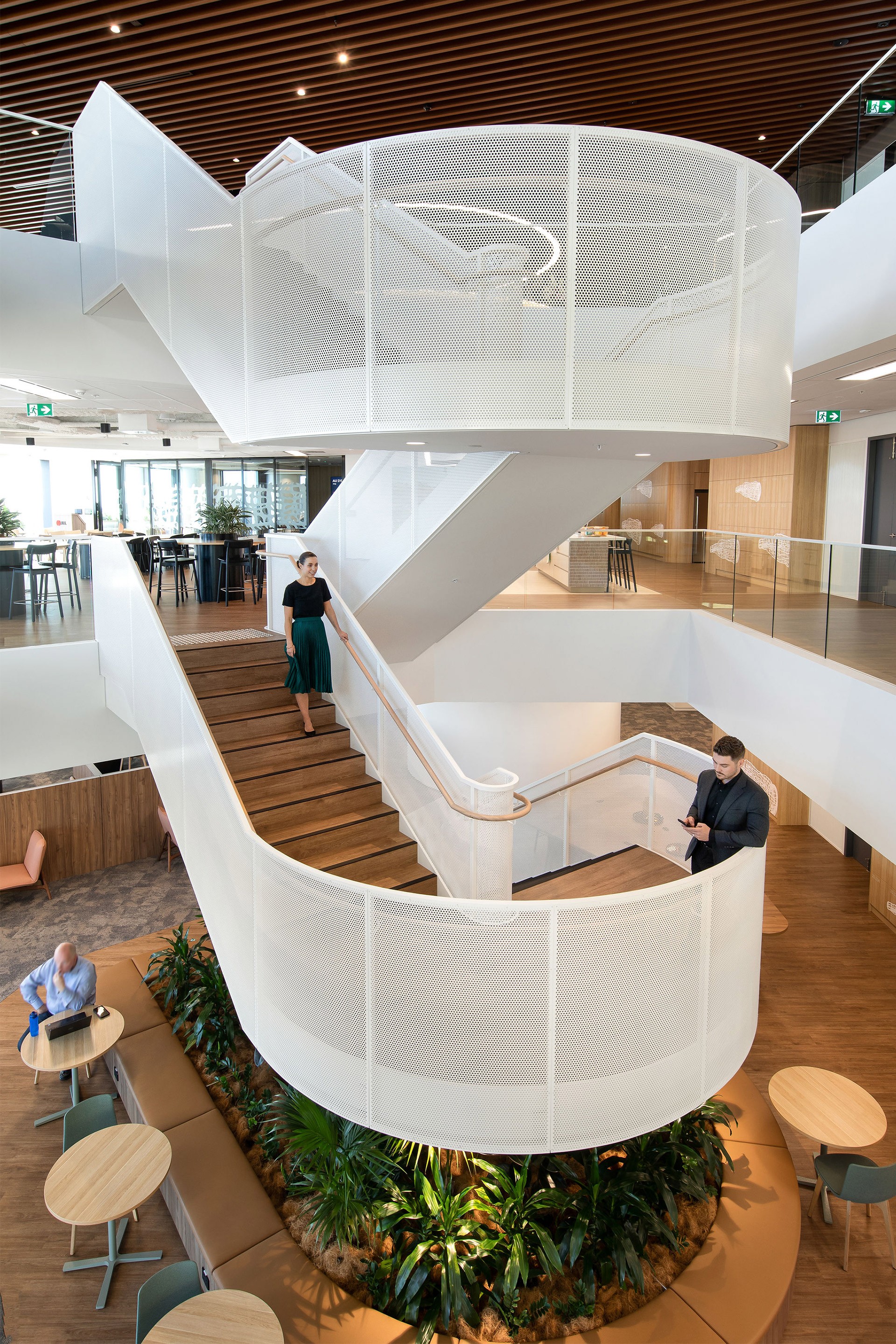 This architectural feature functions not only as a connective element but also embodies JLL’s commitment to a collaborative and engaging work environment. Its unique design encourages employees to use the stairs, facilitating chance encounters and impromptu discussions that enhance teamwork and communication. By prioritising spontaneous interaction, the staircase reflects the ethos of a modern workplace, where creativity thrives through casual conversations and unexpected collaborations.