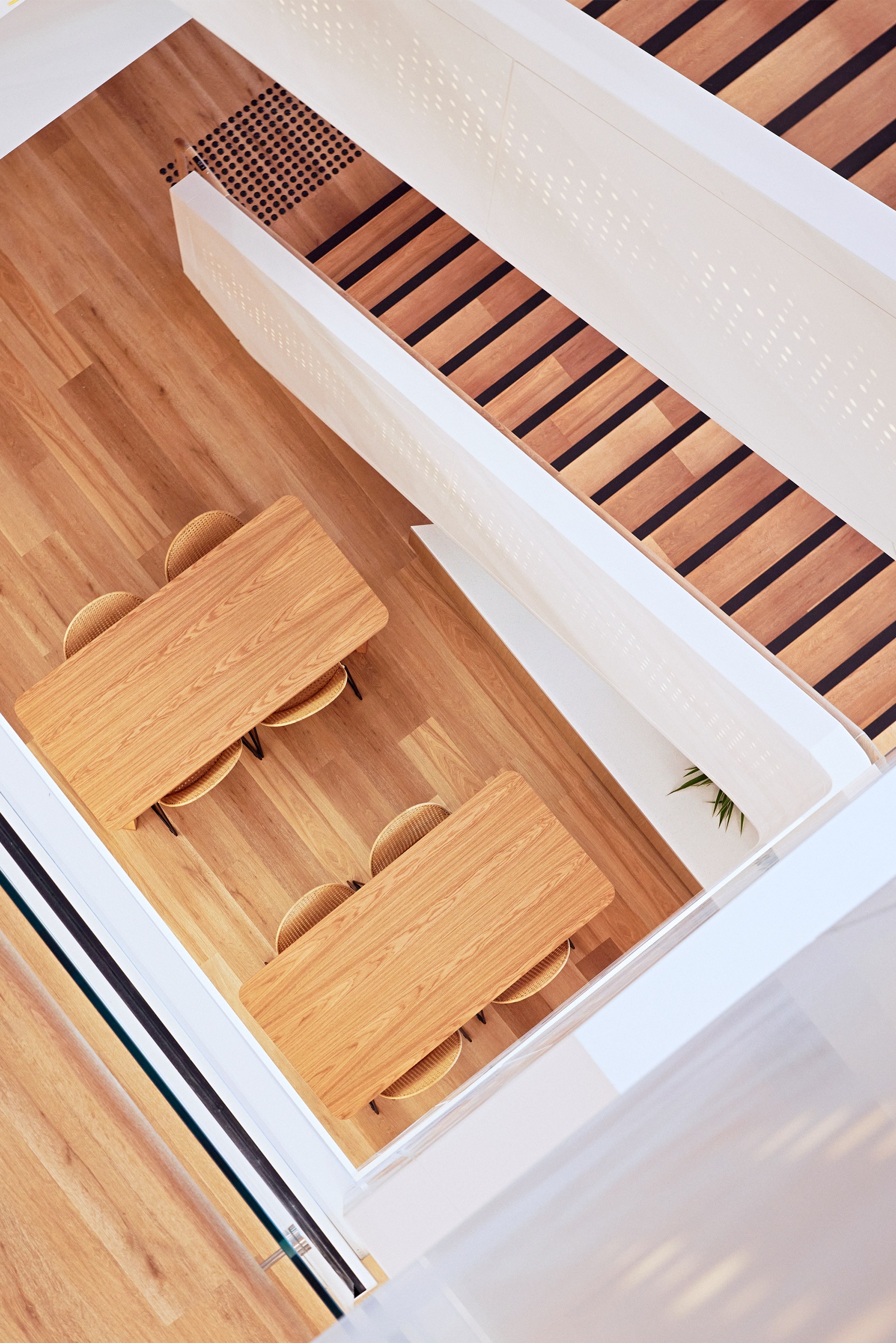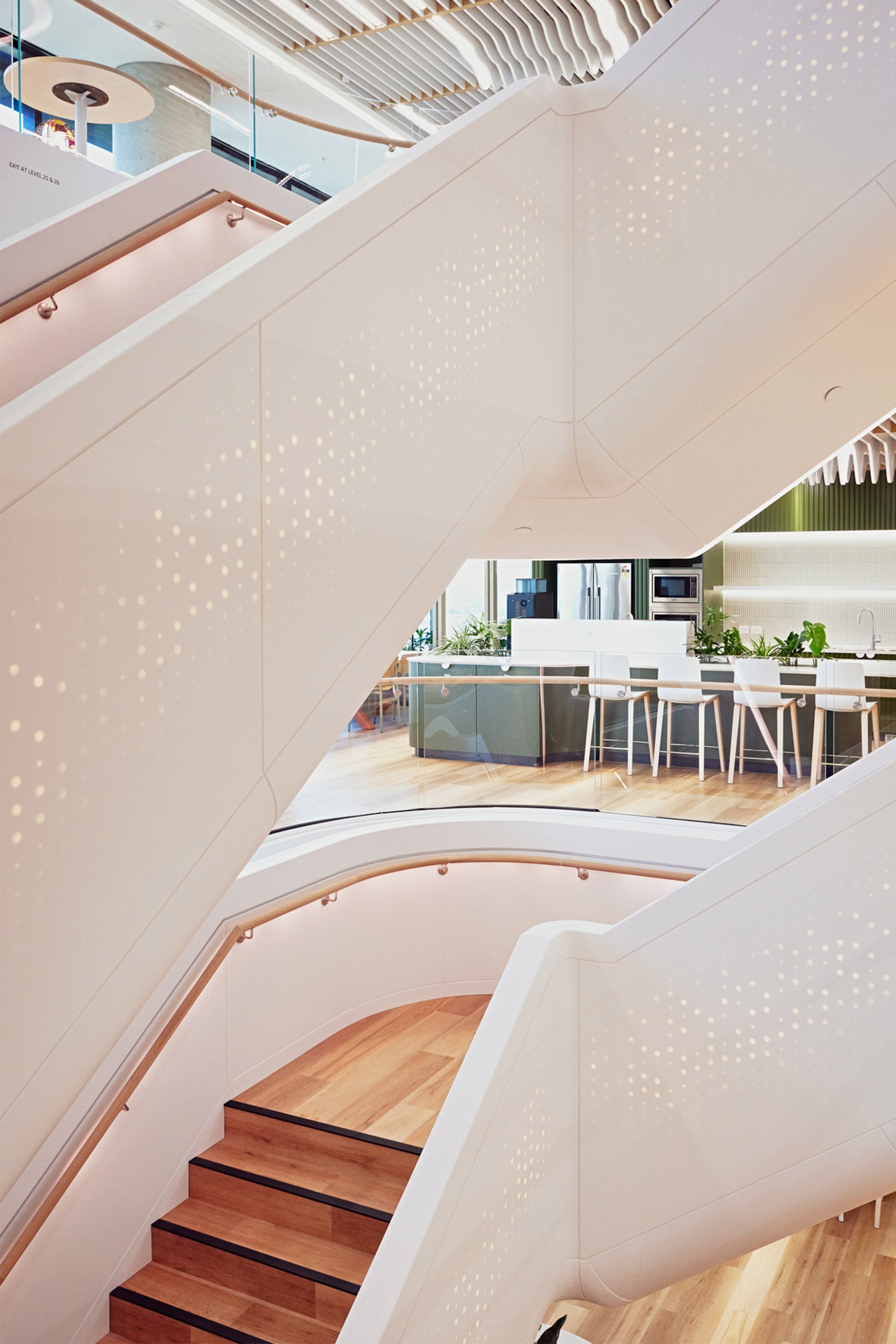 A standout feature is the architectural staircase, fabricated by Asentis. Equipped with built-in LED lighting and sensors, the staircase transforms into a captivating illuminated digital art installation that spans multiple floors, referencing Microsoft’s digital code.