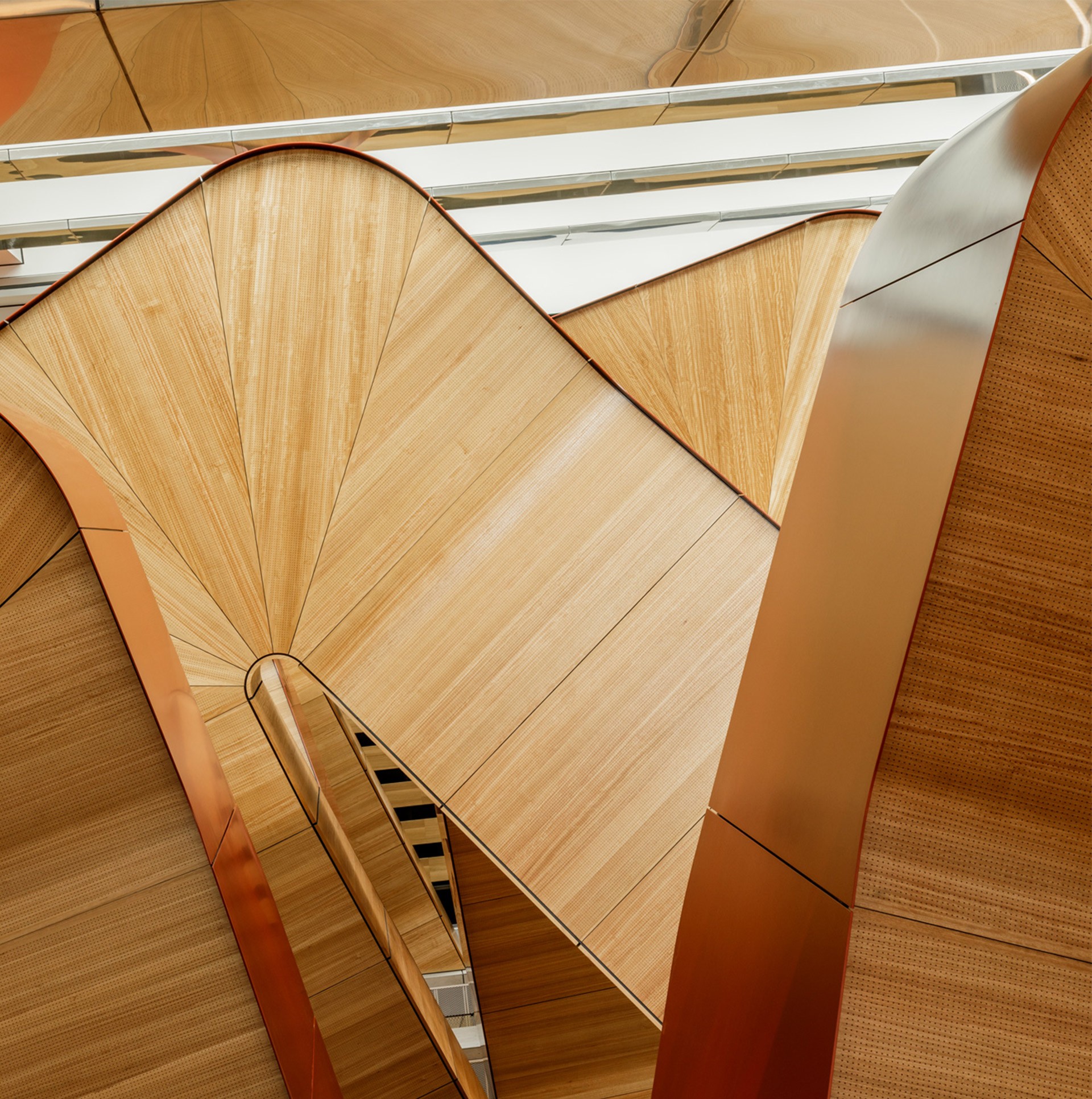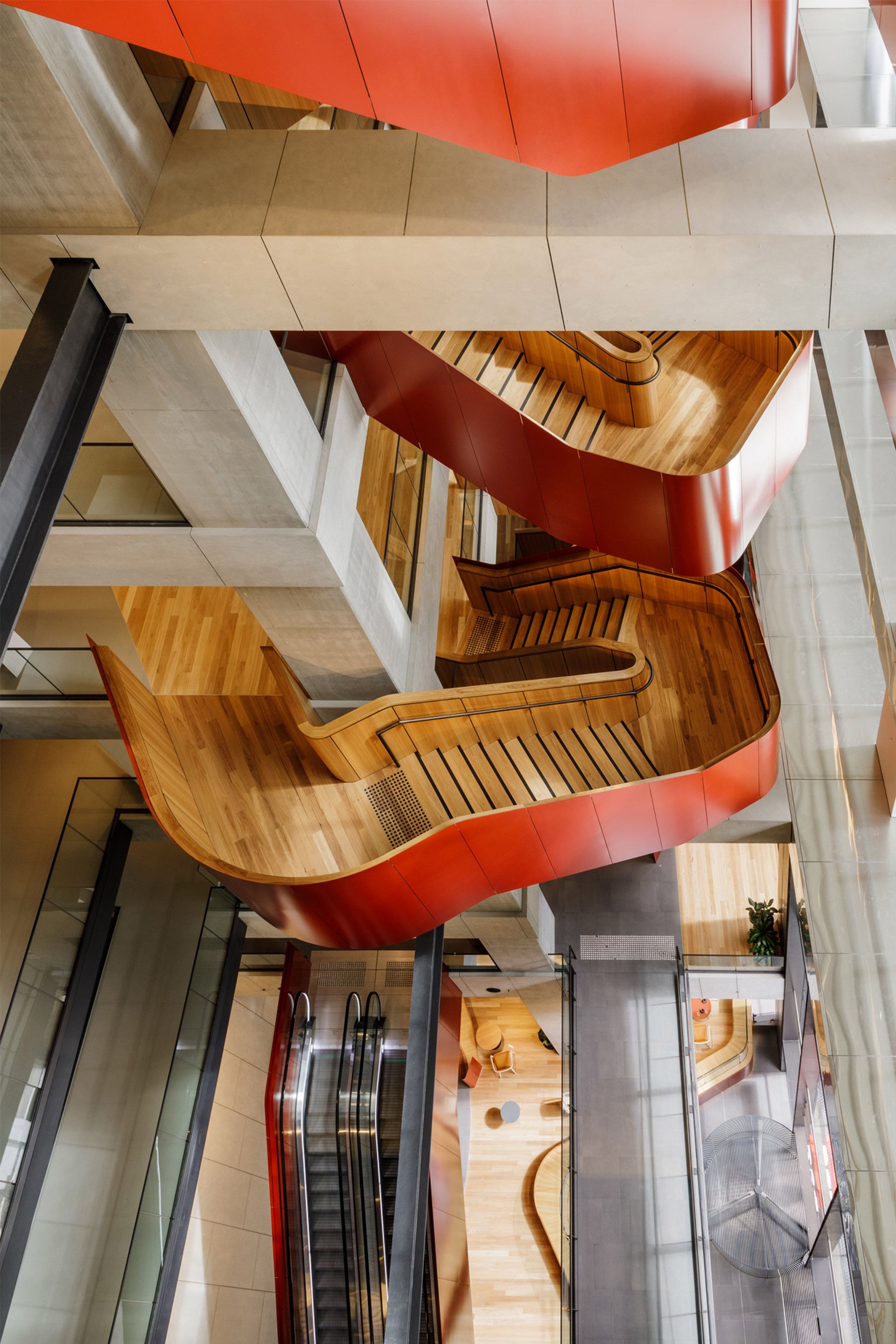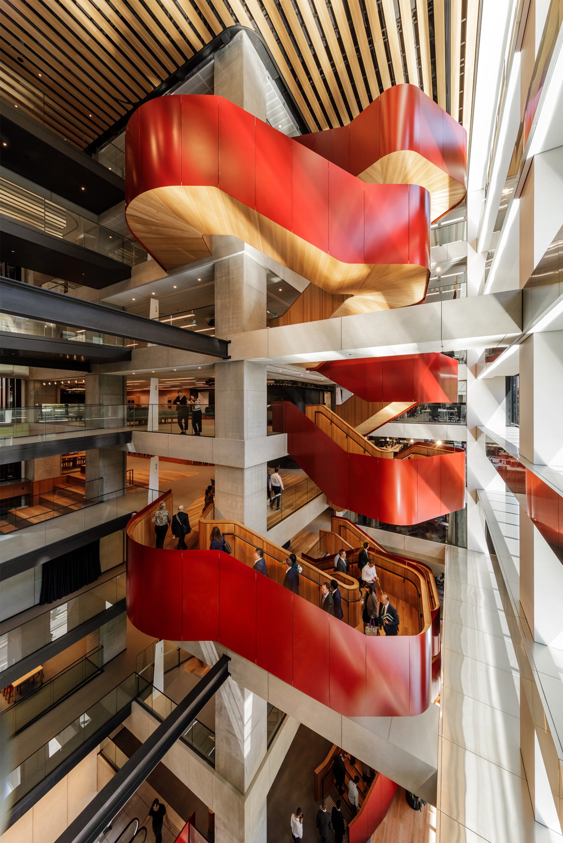 Asentis played a key role in this transformation, delivering a commercial staircase that spans 11 floors and 32,000 square metres of agile workspace. These architectural feature enhances physical and visual connection across the building, with the signature "red-thread" acting as a central design element. Crafted from 10.5 tonnes of structural steel, the staircases are lined with solid Australian hardwood and wrapped in aluminium plating—an elegant fusion of strength, durability, and refined craftsmanship.