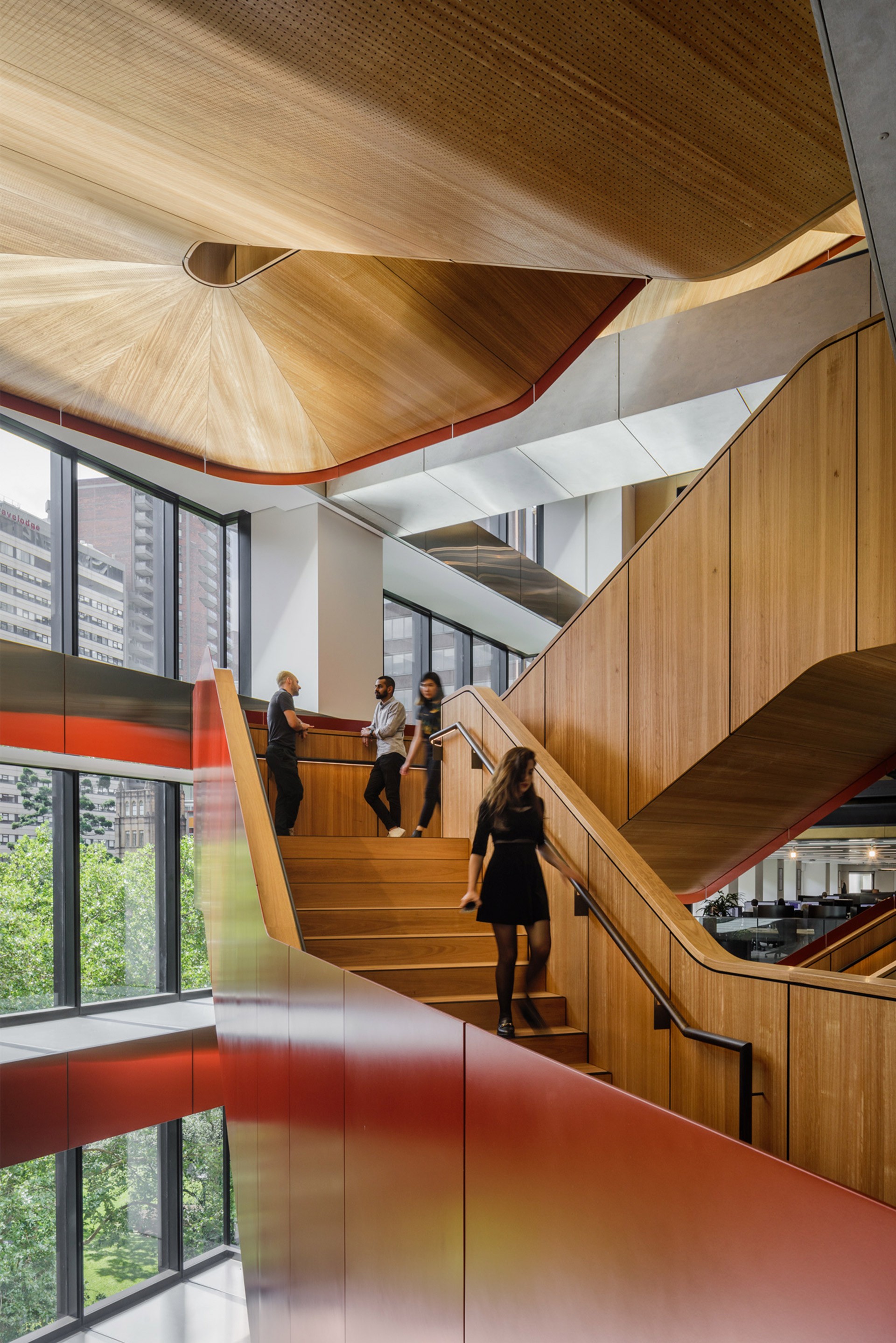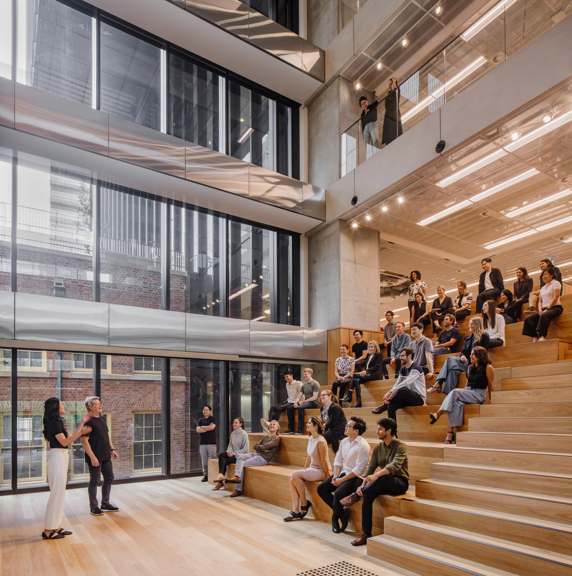 A timber-finished amphitheatre stair further anchors the workplace experience, offering a welcoming social hub and flexible event space. These sculptural forms not only support movement and interaction but also embody the project’s commitment to quality, innovation, and people-centred design.