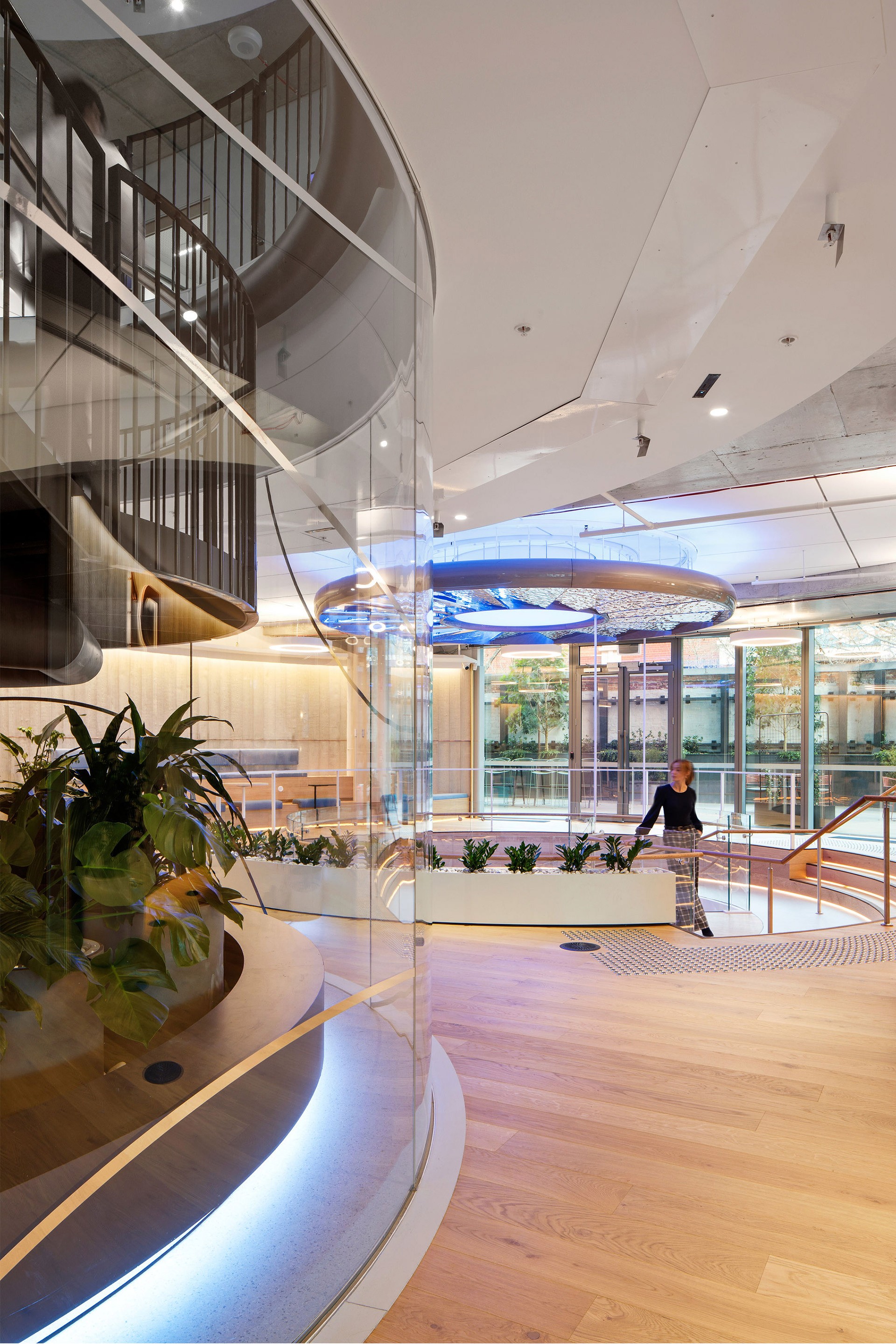 The interior design incorporates key behavioural elements and cutting-edge technology to support hybrid working, a response to the changes brought in work culture. Wellness is a central focus of the environment, with initiatives promoting holistic wellness and sustainability available on each floor. The implementation of a custom-designed water wells link to an app which encourages and tracks staff water consumption.