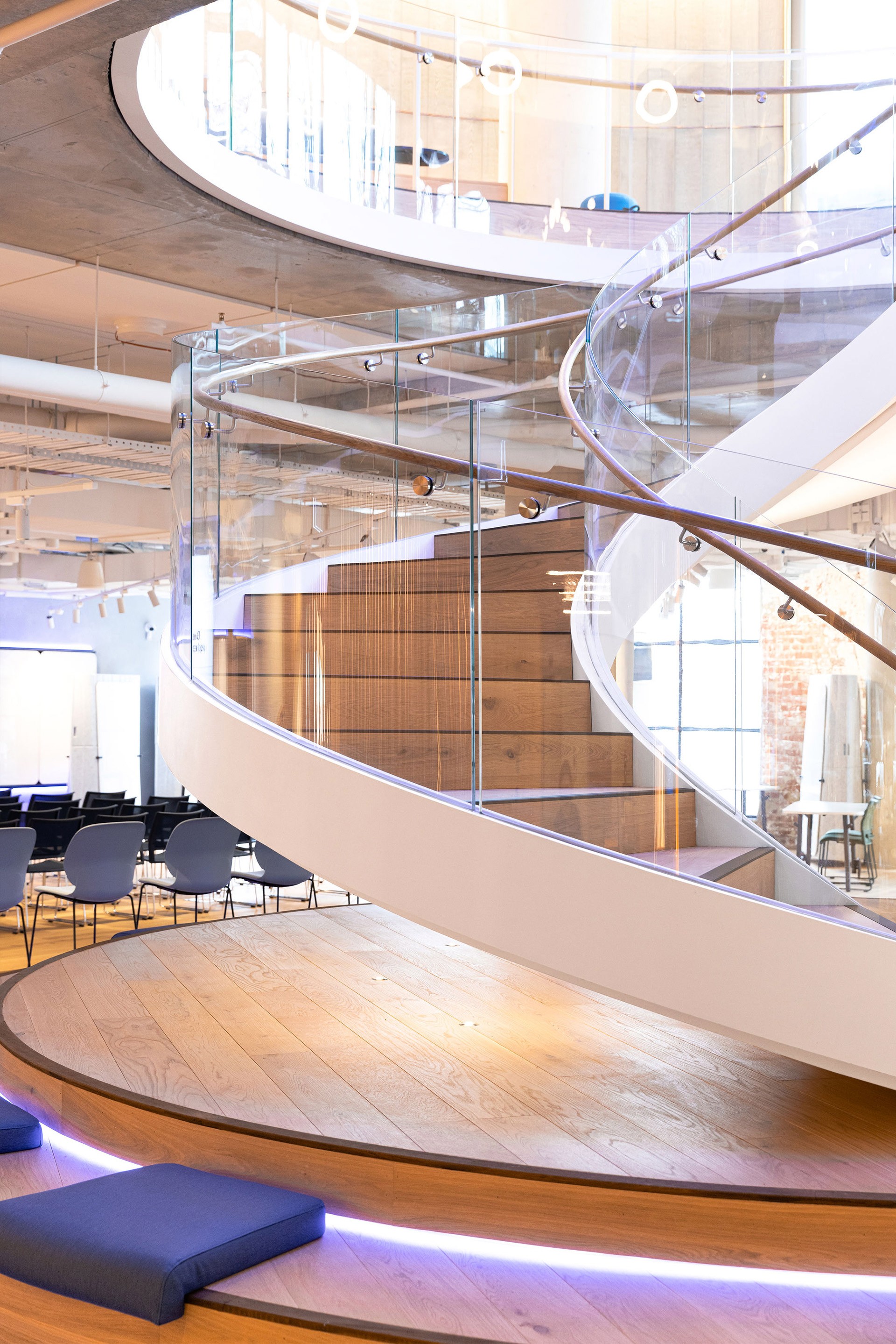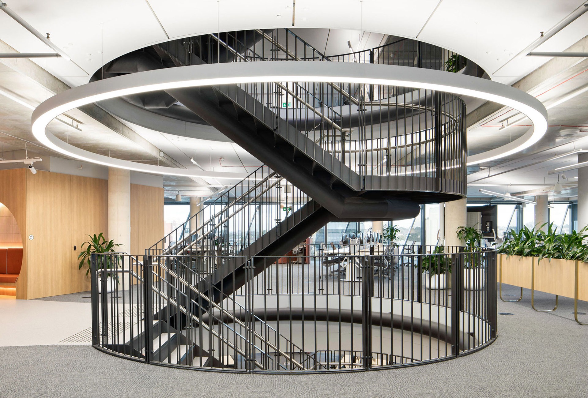 The communication staircase links the working floors from Level 1 to Level 5, facilitating Reece’s hybrid work model focused on agility and flexibility. This staircase features a round mid-landing with a radial view of the workspace, promoting visibility and connectivity. Copper pipes running underneath the staircase further reinforce the water and plumbing aesthetic.