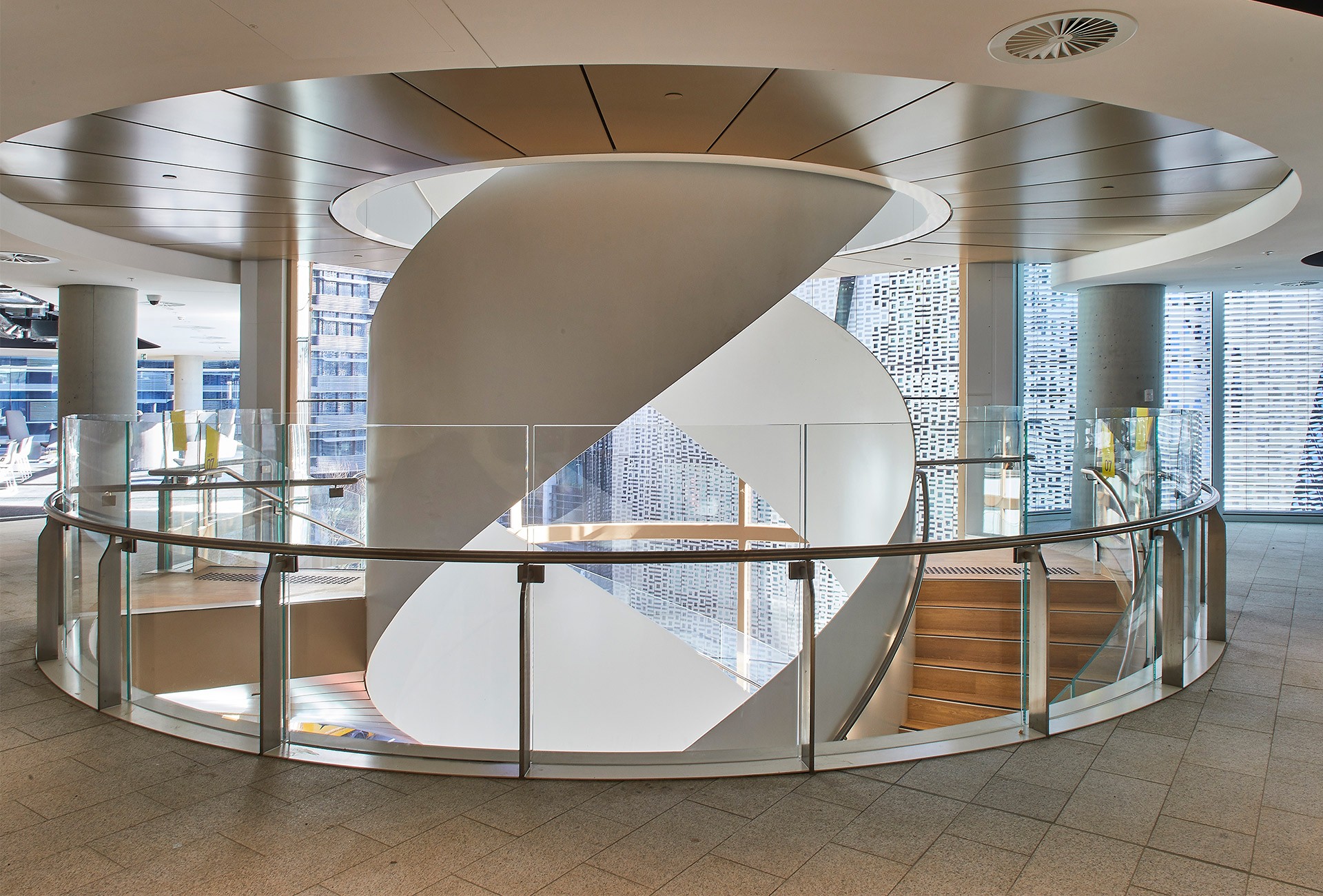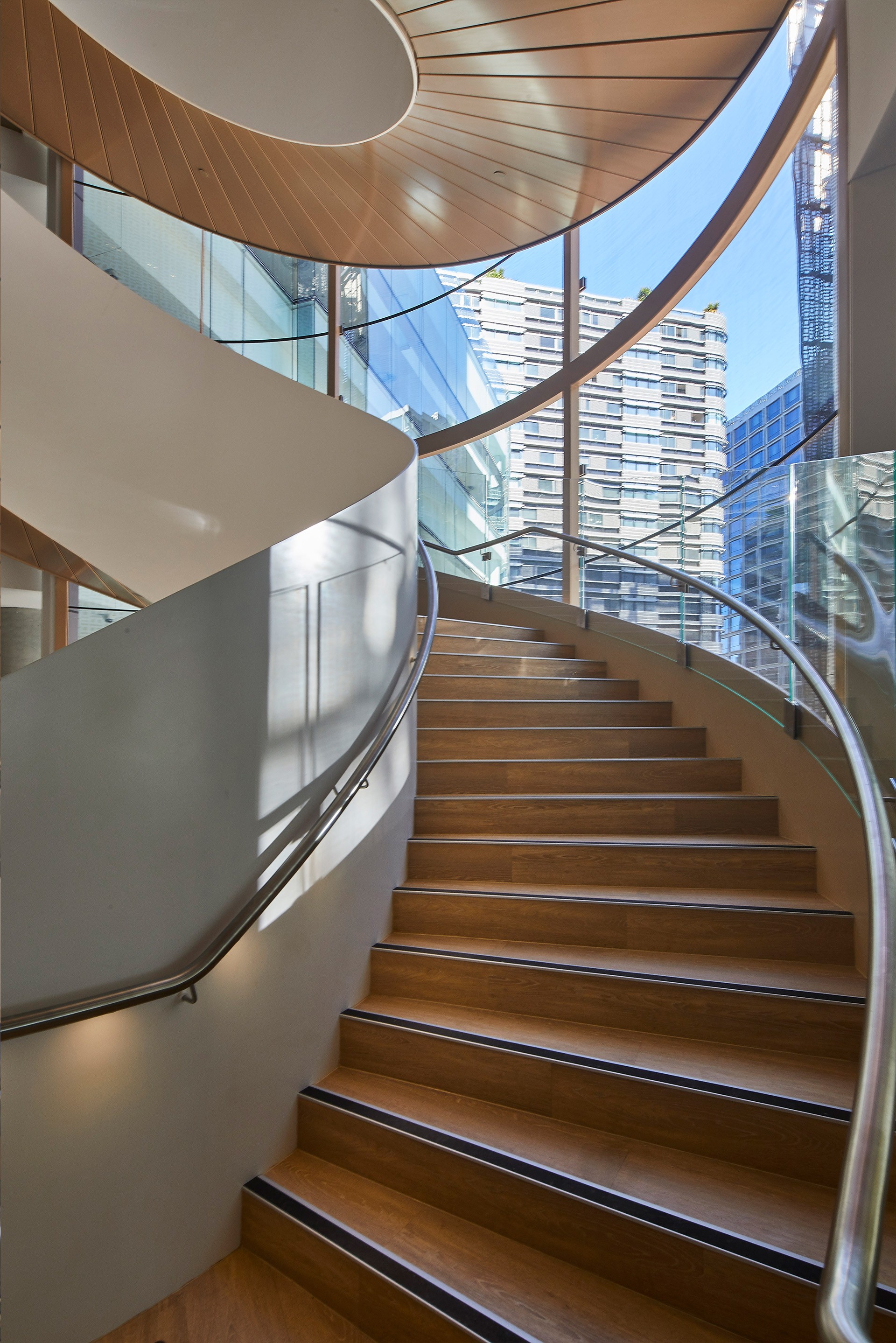 The Double Helix Staircase is comprised of two separate spiral staircases, designed to move twice as many people between levels while occupying the same footprint as a single spiral stair. This allows for both practical function and sculptural beauty, making it one of the most unique staircases not only in Sydney but potentially in the country. The design merges engineering ingenuity with aesthetic appeal, offering a visual reminder of how thoughtful design can elevate a space's functionality.