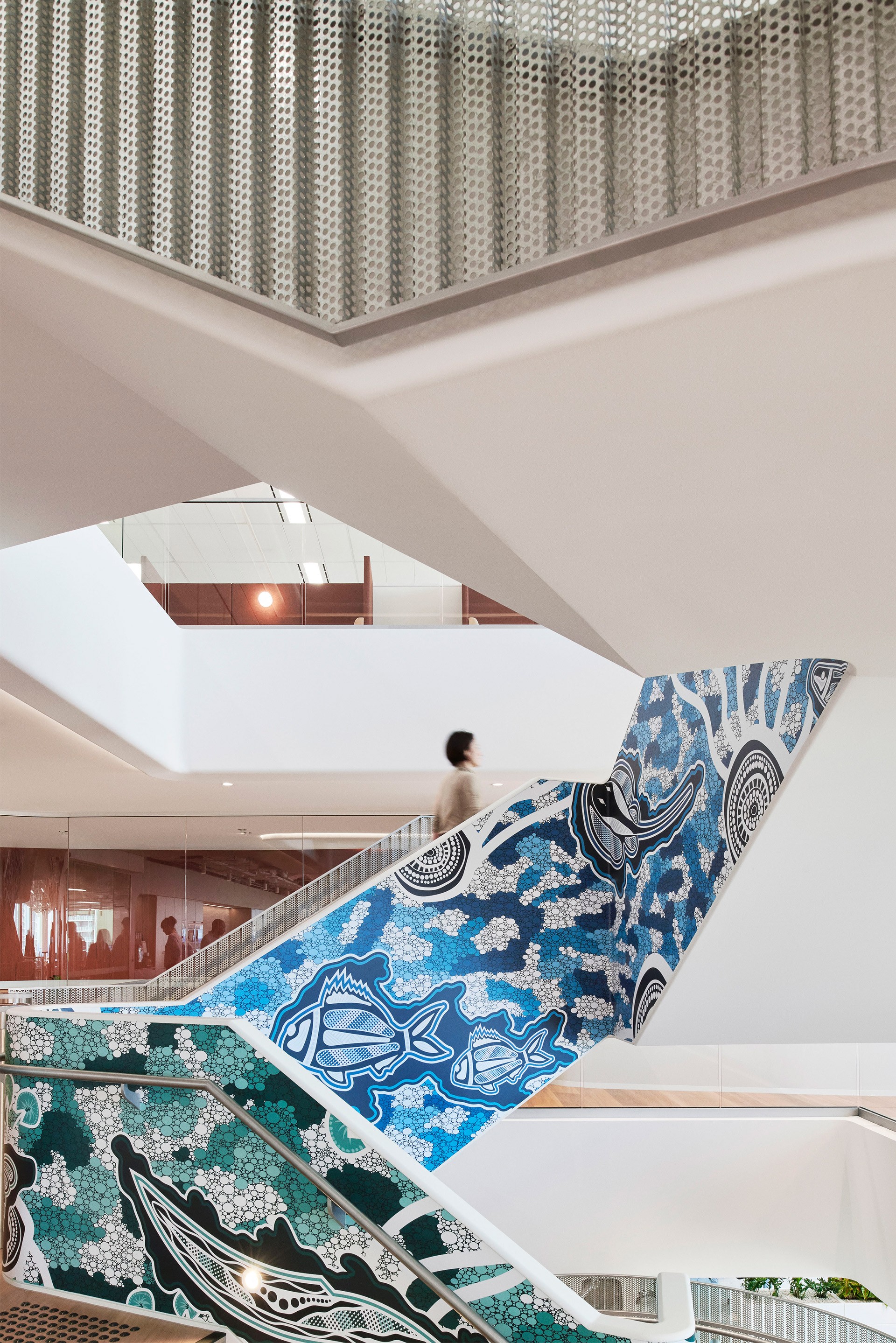 The staircase for WSP’s office fit-out at World Square, Sydney, serves as a testament to quality, sustainability, and cultural connection. Featuring a unique corrugated perforated mesh balustrade, it offers transparency and an airy feel, while indigenous artwork by local artist Shane Youngberry adds cultural significance. Sustainable materials reflect Asentis' commitment to eco-friendly practices, with water-based paints and mill-finish mesh minimising environmental impact.